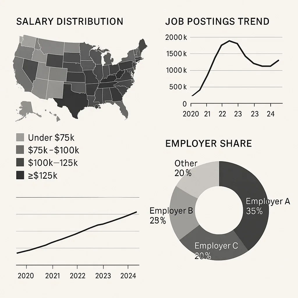 A research‑grade report for staffing/placement decisions: job demand by region, salary bands, employer counts, and talent supply signals. Blend postings data, labor stats, and competitive signals into a single view you can discuss with stakeholders. Use it to prioritize markets, calibrate pay ranges, and shape recruiting tactics.